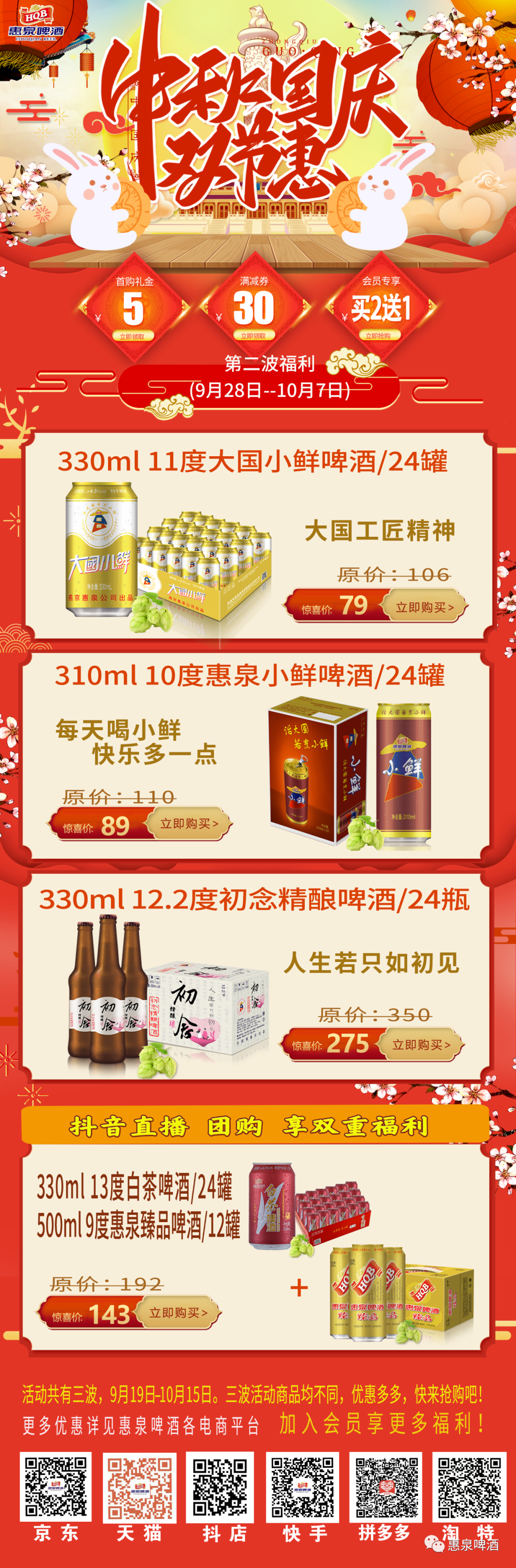 各位亲们,可登录惠泉啤酒抖音、快手、天猫、京东、拼多多等电商旗舰店选购您心仪的啤酒,趁此长假约上一局,让惠泉啤酒带给您一场轻奢、微醺的国庆欢乐假期。